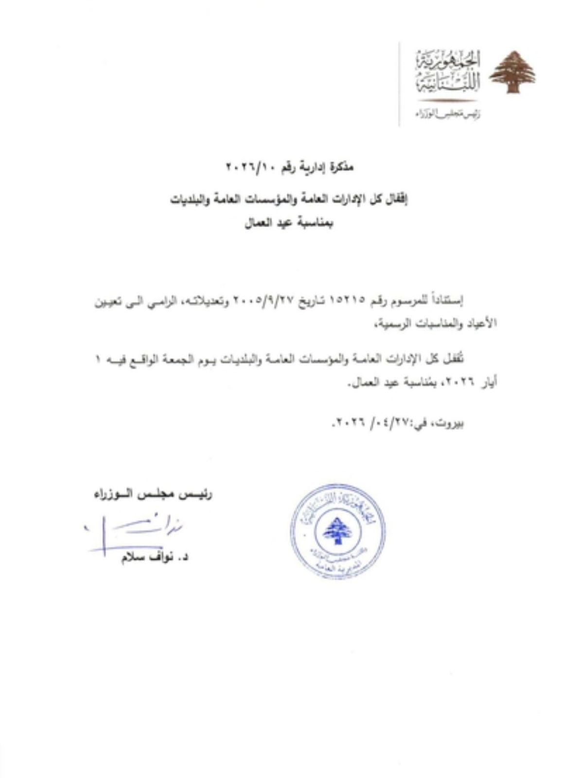 أصدرت إدارة مجلس الوزراء مذكّرة بشأن إقفال كل الإدارات العامّة والمؤسسات العامة والبلديات بمناسبة عيد العمّال. Subtitle Date Menu Body الرئيسية إدخال Autho