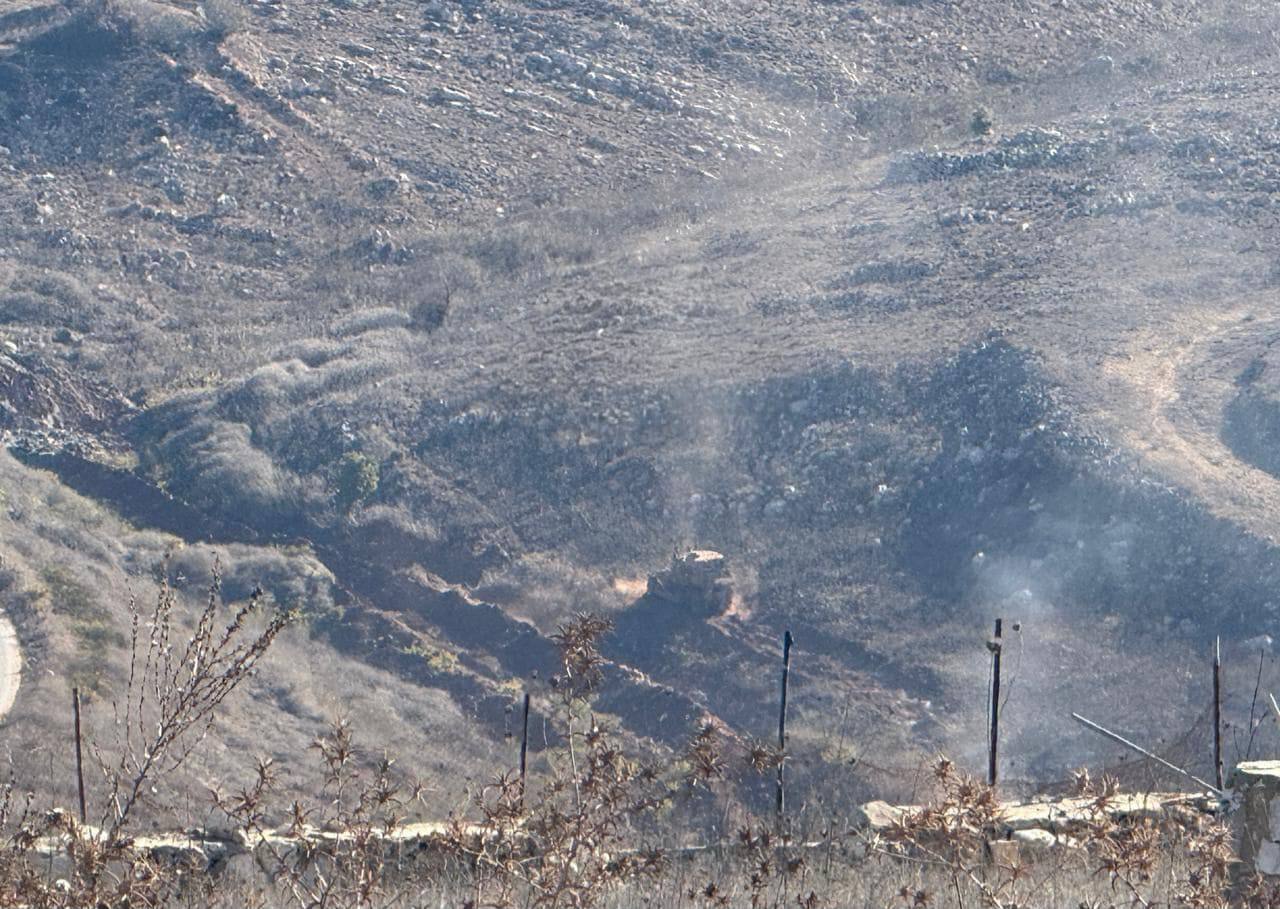 جرافة عسكرية إسرائيلية بحماية عدد من الاليات والدبابات تقوم بعملية تجريف داخل الأراضي اللبنانية اسفل موقع "المرج" بين بلدتي عديسة ومركبا