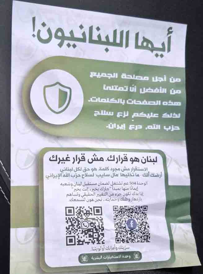 ولاحقاً، صدر عن قيادة الجيش - مديرية التوجيه البيان الآتي: ألقت طائرة إسرائيلية منشورات ورقية فوق مدينة بيروت، تتضمن رمزًا لرابط (QR Code) يعود على تطبيق واتساب وآخر على منصة فايسبوك للتواصل مع وحدة الاستخبارات البشرية «الوحدة ٥٠٤» في الجيش الإسرائيلي التي تُعنى بتجنيد العملاء. تُحذر قيادة الجيش المواطنين من خطورة مسح الرمز والدخول إلى هذه الروابط لما ينطوي عليه من مسؤولية قانونية وخطر أمني، إضافةً إلى التمكّن من خرق الهواتف الخلوية والوصول إلى البيانات الشخصية.