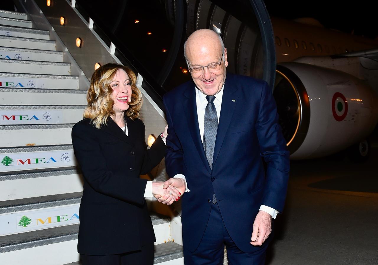وفي اطار الاهتمام الاوروبي والدولي بما يجري في الجنوب، وصلت مساء امس الى مطار رفيق الحريري الدولي رئيسة وزراء ايطاليا جورجينا ميلوني واستقبلها الرئيس نجيب ميقاتي، قبل ان ينتقلا الى السراي الكبير، حيث اقيمت لها مراسم استقبال رسمية، قبل عقد المحادثات الرسمية.