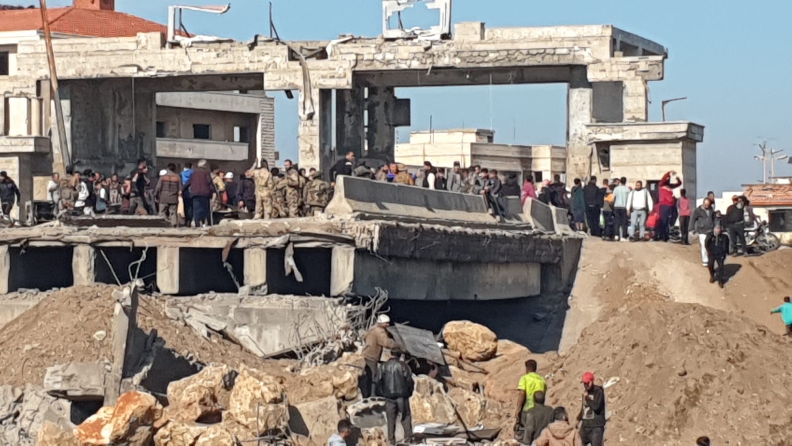 عند معبر العريضة المدمّر: عناصر من هيئة تحرير الشام مع حشد من المواطنين عند معبر العريضة المدمّر: عناصر من هيئة تحرير الشام مع حشد من المواطنين