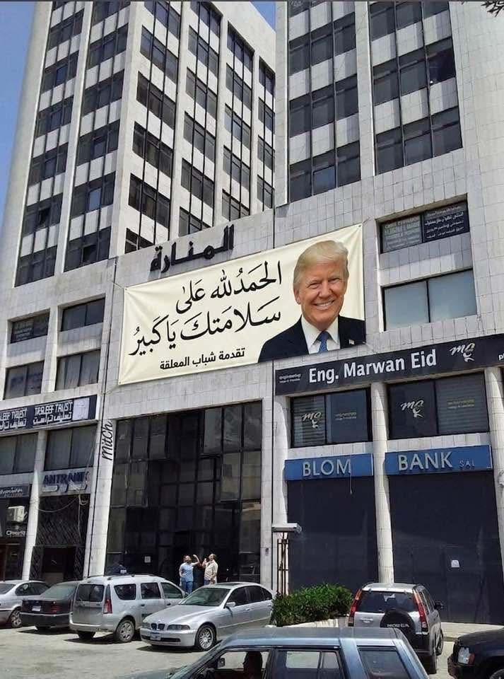 على الطريقة اللبنانية رفعت يافطة كبيرة على مدخل مدينة زحلة في البقاع، وتحديداً على سنتر خزاقة، تتمنى السلامة للرئيس الاميركي دونالد ترامب، بعد استهدافه في العشاء الاعلامي في البيت الابيض، وذلك على الطريقة اللبنانية.