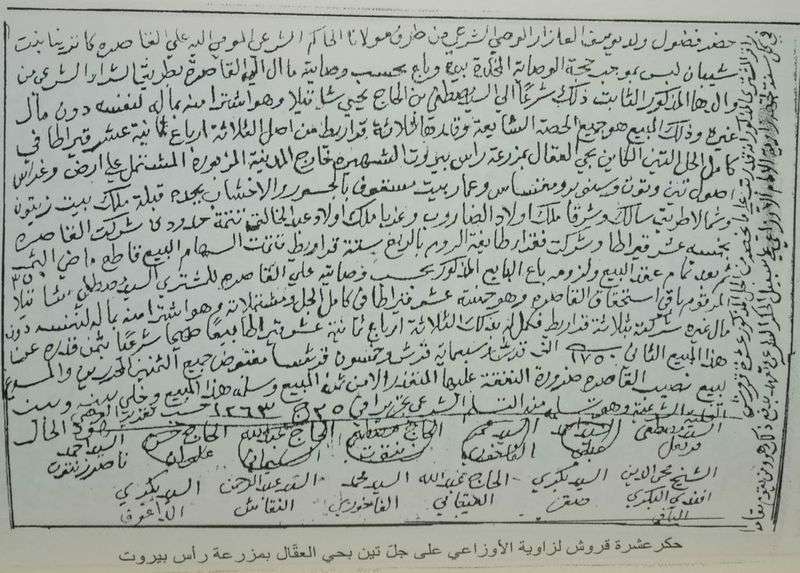 وتبيّن من الحكم الصادر سنة 1955 بقضايا الرمول انه بتاريخ 13 شوال سنة 1272هـ/ 1856م اشترى الشيخ مصطفى عبد القادر الرفاعي مـــن الأمير فندي أسعد قعدان شهاب زوج عليا بنت الأمير بشير وبوكالته عن الأمير بشير قاسم شهاب جميع الأراضي المعروفة بسهل الإمام الأوزاعي بموجب حجة شرعية وكانت تلك الأراضي محدودة قبلة بأراضي الغدير وشمالاً بوطا بطينا وشرقاً بالطريق السالك الى صيدا (طريق صيدا القديمة) وغرباً بالبحر المالح بثمن قدره عشرون ألف غرش ومصادق على الحجة بإمضاء وختم قاضي بيروت السابق السيد محمد حميد وبشهادة شخصيات عديدة من رجال الدين والدنيا كالمشايخ أحمد الصلح ويوسف الأسير ومحيي الدين اليافي والحاج عبد الله بيهم ومحمد البربير ونعوم تابت وسواهم وجرت استنادا الى تلك الحجة عدة عقود بيع وقسمة من بعض ورثة مصطفى الرفاعي تناولت أسهماً شائعة من سهل الأوزاعي الى سليم واسكندر طراد وشربل التحومـــــي ونخلة سرسق وغيرهم.
