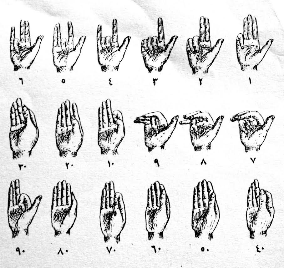 جاء في «كشف الظنون» في كلامه عن أنواع الحساب قوله «ومنها علم حساب العقود أي عقود الأصابع، وقد وضعوا كلاً منها بإزاء أعداد مخصوصة، ثم رتبوا لأوضاع الأصابع آحاداً وعشرات ومئات وألوفاً، وهذا عظيم النفع للتجار ولا سيما عند استعجام كل من المتبايعين لسان الآخر وعند فقد الآت الكتابة».