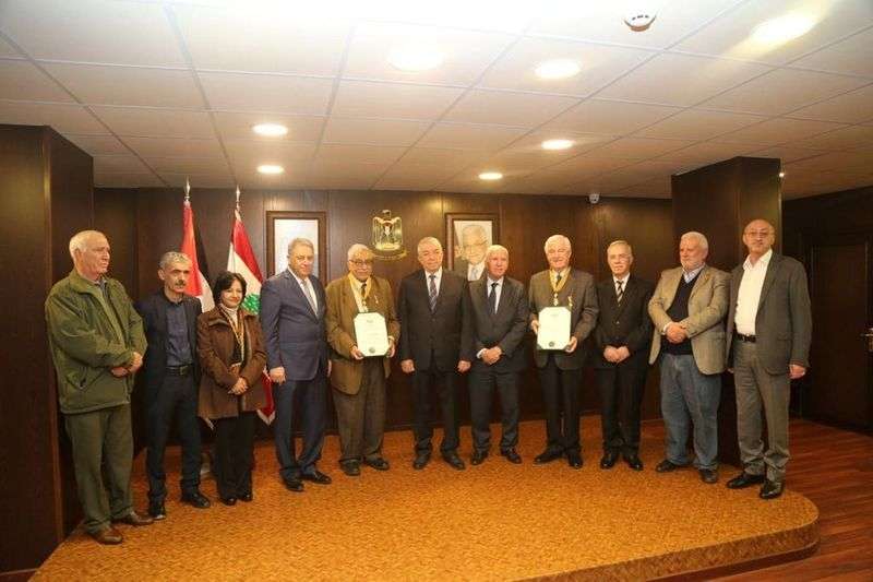 وقلّد نائب رئيس حركة «فتح» محمود العالول ممثلاً الرئيس عباس، الوسامين بحفل تكريمي أُقيم في قاعة الرئيس ياسر عرفات في سفارة دولة فلسطين في بيروت، بحضور: عضو اللجنتين التنفيذية لـ»منظمة التحرير الفلسطينية» والمركزية لحركة «فتح» عزام الأحمد، عضو اللجنة المركزية لحركة «فتح» سمير الرفاعي، سفير دولة فلسطين في لبنان أشرف دبور، أمين سر حركة «فتح» وفصائل المنظمة في لبنان فتحي أبو العردات، عضو المجلس الثوري لحركة «فتح» أمنة جبريل، أمين سر المجلس الاستشاري لحركة «فتح» فهمي الزعارير، عضوا قيادة حركة «فتح» في لبنان اللواء منذر حمزة واللواء صبحي أبو عرب، مقرر الحملة الأهلية ناصر حيدر وعضو الأمانة العامة لـ»المؤتمر القومي العربي» كريم رزقي.