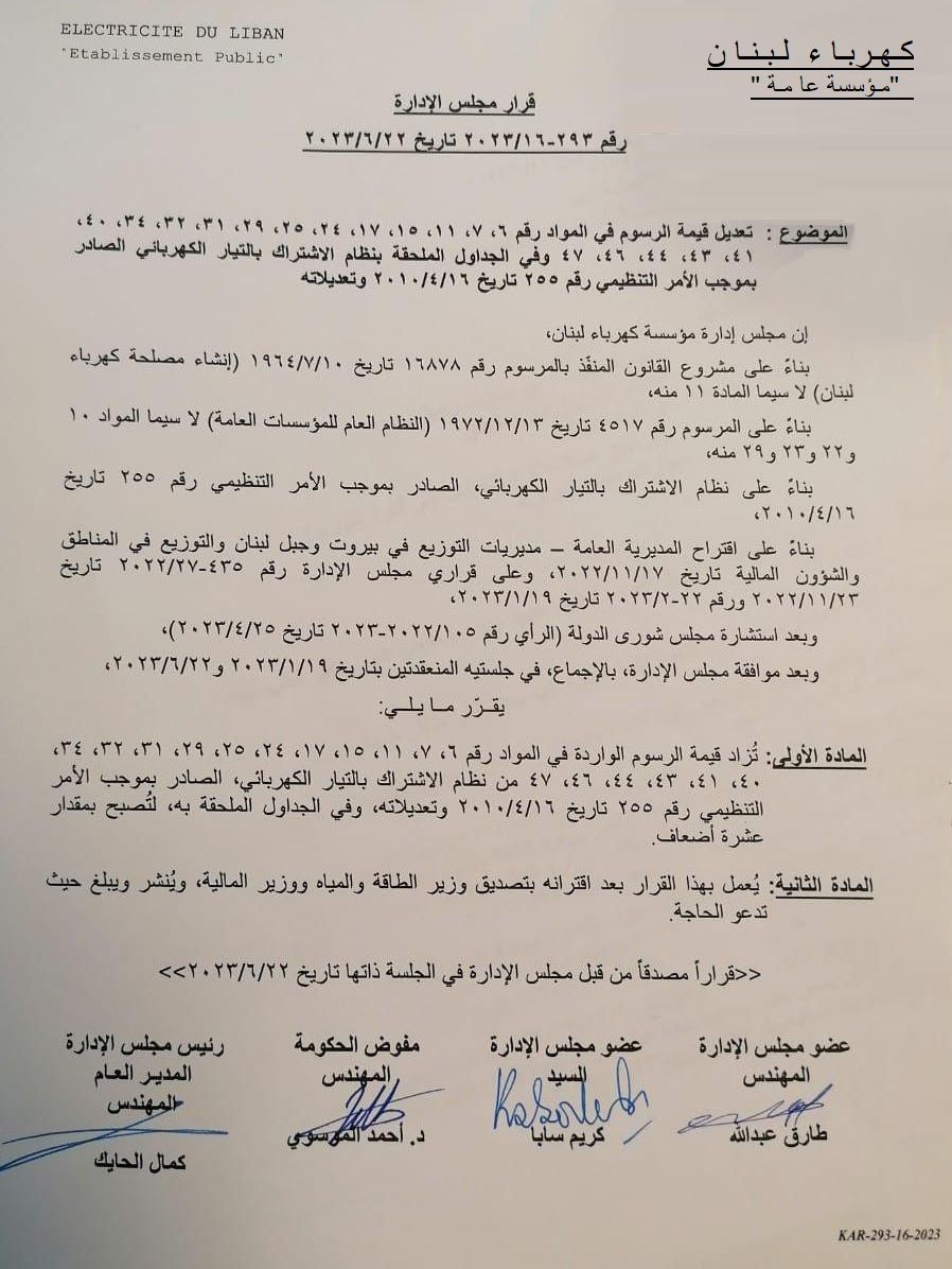 أقرّ مجلس إدارة كهرباء لبنان زيادة قيمة الرّسوم في المواد رقم 6, 7, 11, 15, 17, 24, 25, 29, 31، 32، 34، 40، 41’ 43, 44, 46, 47, وفي الجداول الملحقة بنظام الاشتراك بالتيار الكهربائي الصادر بموجب الأمر التنفيذي رقم 255 تاريخ 16/04/2010 وتعديلاته، بنسبة 10 أضعاف.