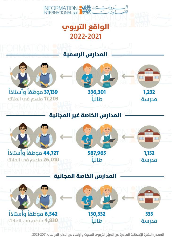 1,152 مدرسة تضم 587,965 طالبًا و44,727 موظفًا وأستاذًامنهم 26,010 في الملاك.