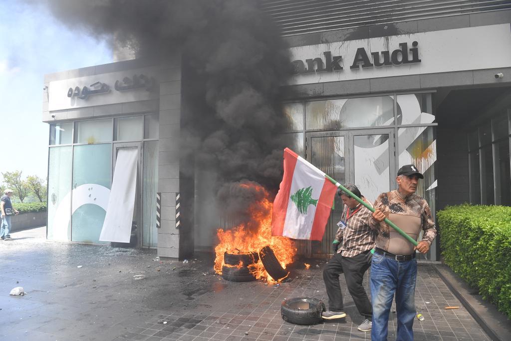 أقدم عدد من المحتجّين على تحطيم الواجهات الزجاجية لبنك عودة وبنك بيروت في سن الفيل وبنك بيبلوس بين مستديرتي الصالومي والمكلس، وأشعلوا الإطارات عند مداخله.