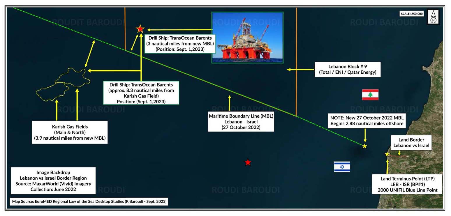 وعن رأيه في احتمالية موجودات الـ«بلوك 9» وعما إذا كان هناك من أمل، يقول بارودي:«إذا نظرنا إلى هذه الخريطة الحصريّة لـ«المركزية» والتي تُظهر موقع باخرة BARENT Ocean Rig، سنرى من موقعها أنها بالكاد تبعُد 3 أميال فقط عن خطوط الحدود البحرية الجديدة بين لبنان وإسرائيل. وإذا نظرنا أيضًا إلى الجنوب الغربي، فهي بعيدة حوالي 8.3 أميال، هذه هي المسافة التي تفصلها عن حقل غاز «كاريش». إضافة إلى ذلك، فإن أن سفينة الحفر لا تبعُد أكثر من 25-30 ميلاً عن الخطوط البحرية اللبنانية القبرصيّة حيث تم اكتشاف كميّات تجاريّة. من هنا، فإن احتمال وجود كميّات تجاريّة في البلوكات اللبنانية 8 و9 و10 وفقًا لعلماء الجيولوجيا الأميركيين، مرتفعة جدًا.