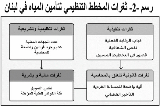 لنحلل بدقة الثغرات في النظام القانوني والمؤسسي لتأمين المياه في لبنان حتى عام 2025، وتسهيلا لفهم التقصير في تأمين المياه سوف نقسم الثغرات الى أربع أقسام رئيسية (الرسم -2-): أولا، تنظيمية - تشريعية، ثانيا تنفيذية، ثالثا، مالية وبشرية، رابعا، قانونية تتعلق بالمساءلة والمحاسبة.