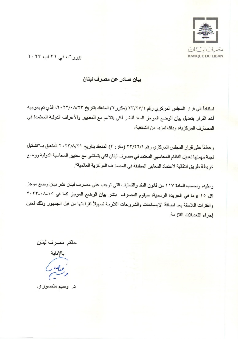 أعلن حاكم مصرف لبنان بالانابة وسيم منصوري أن المصرف سيقوم بنشر بيان الوضع الموجز كما في 15-08-2023 والفترات اللاحقة بعد إضافة الايضاحات والشروحات اللازمة تسهيلا لقراءتها من قبل الجمهور وذلك لحين إجراء التعديلات اللازمة، وذلك بحسب المادة 117 من قانون النقد والتسليف التي توجب على مصرف لبنان نشر بيان وضع موجز كل 15 يوما في الجريدة الرسمية.