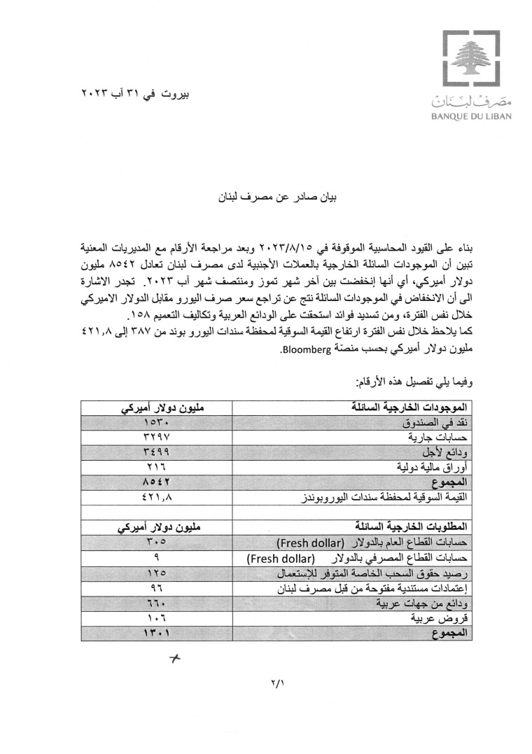 كما نشر مصرف لبنان تقريراً مفصلاً حول موجوداته السائلة الخارجية بالعملات الأجنبية، وأعلن انخفاضها بسبب تراجع سعر صرف اليورو مقابل الدولار الأميركي، وتسديد فوائد استحقت.