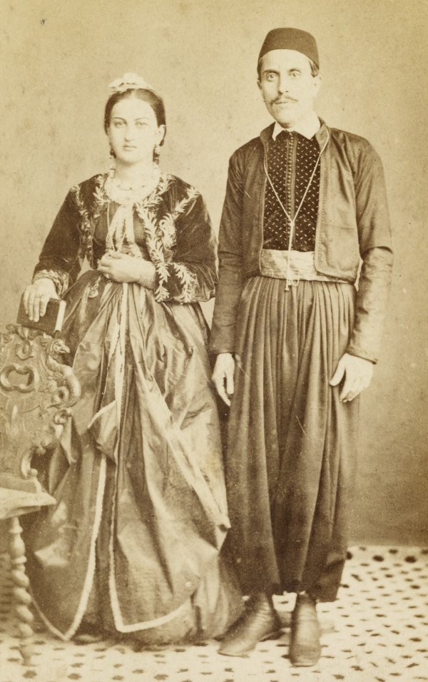 «إذا كنت على معرفة خاصة بسيد المنزل، فإن السيدات يكرموك بحضورهن، ويقدمن لك شخصياً الشربات أو المربّى، ثم يبقين في غرفة الجلوس دون حجابهن، مما يسمح لك بتفحّص ملامحهن الجميلة وملابسهن الفاخرة في وقت فراغك. تراهن يرتدين بنطالات واسعة قريبة من الكاحل. ويغطى هذا الثوب الأول برداء طويل مفتوح من الأمام، مع وشاح حريري ذو ألوان زاهية يلبس كحزام، أو بشال من الكشمير الهندي. ثم تأتي سترة ضيقة مطرزة بخيوط ذهبية، بأكمام ضيقة تصل إلى المرفق. إن شفافية بلوزاتهن تجعل صدورهن مرئية بشكل خفي. وينسدل شعرهن، المضفر بعدد لا يحصى من الضفائر، على ظهورهن في ضفائر تضاف إليها ضفائر حريرية ذات ألوان متطابقة، مرصّعة بعملات ذهبية ومثبتة بشكل مستقيم بوزن الخواتم. ويرتدين قلنسوة صغيرة من الصوف الأحمر، مطرزة بالذهب، مع شرابة ذهبية سميكة، مثبتة فوق رؤوسهن بفخامة. حواجبهن ورموشهن مصبوغة بعناية باللون الأسود. يتم صبغ أظافرهم وكف أيديهم حتماً بالحناء إلى اللون البني المحمر، وهو لون غير مريح للناظر؛ العديد منهن يضعن المكياج أيضاً».