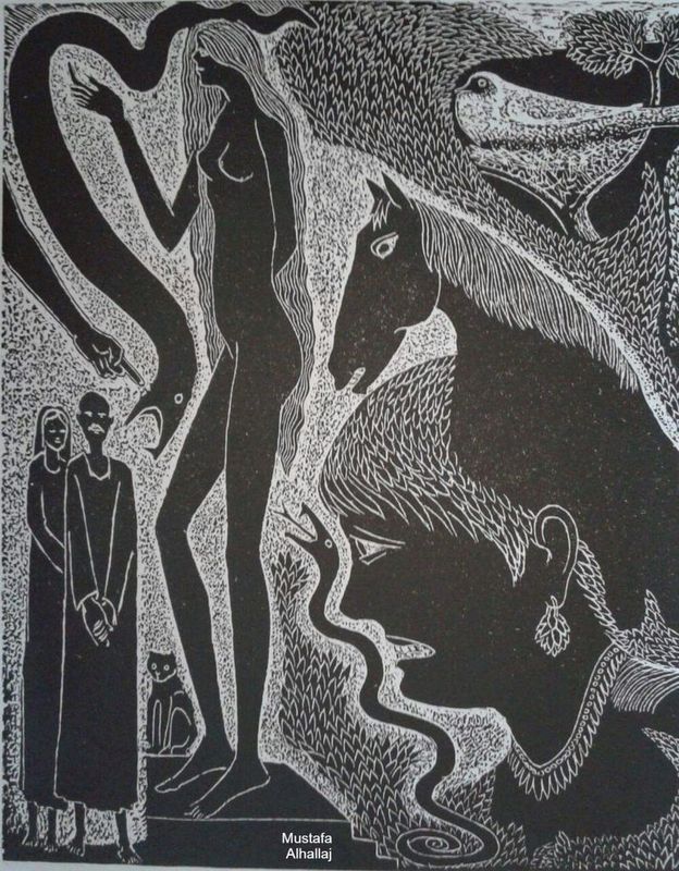 في لوحات الفنان مصطفى الحلاج تآخٍ وصراعات، والحصان رمز القوة والعروبة والخصوبة، والغموض هو البحث عن الحلول المستعصية التي يتركها في زركشات دقيقة يمنحها حالة جمالية هي المزج بين الحزن والفرح، وصولا الى الكآبة من عصر تم فيه احتلال فلكلوريات الوطن التي شحنها بالرموز العربية الاصيلة. إنْ من خلال الاحصنة والحركة التي تتمثل بالليونة والقوة على مادة جامدة قاسية. الا انها من مواد طبيعية حية وما الحفر على الماروينيت. الا الرسم الذي يتحدى به الفنان المادة، فيسخرها لتضح بالرسومات ذات الرؤية العربية المدججة برموز وحكايات تؤرخ لتراث فلسطين، وما تترجمه الخطوط الكثيفة من متكسر لمتعرج لمنحنٍ لمائل مبتعدا قدر الامكان عن الخط العمودي وان تواجد في لوحاته. الا ان نسبته قليلة جدا بالنسبة للخطوط الاخرى. اضافة الى المفاهيم الرياضية التي يشحنها بالمقاييس، لتكون بمثابة المحاكاة النسبية لفن يحتاج لمقاييس ومعايير محددة، لتبقى اللوحة كالنص البصري المعتق او القديم الذي يؤرخ لعصر لا يريد الحلاج الخروج منه، وهو سمة العصر الفلسطيني المتحرر من اي احتلال تصرخ منه لوحات الحلاج، وتجعل من التصوير حكايات اسطورية هي جوهر القضية الفلسطينية في فنه وجوهر بلاد الشام، وما ترمز اليه شخوص لوحاته. ان المرأة او الطبيعة او الاشجار او التعبير الخصب عن الرؤى المحصورة في لوحة تحتاج الى الخروج منها او السعي لتحقيقها، وكأنّه يحتفظ بالحكايا الفلسطينية بين الابيض والاسلوب، وبين الخطوط نفسها التي ينسجها بتصوف يميل الى خلق الابعاد وكأن تفاصيل لوحاته تتمدد الى ما لا نهاية .