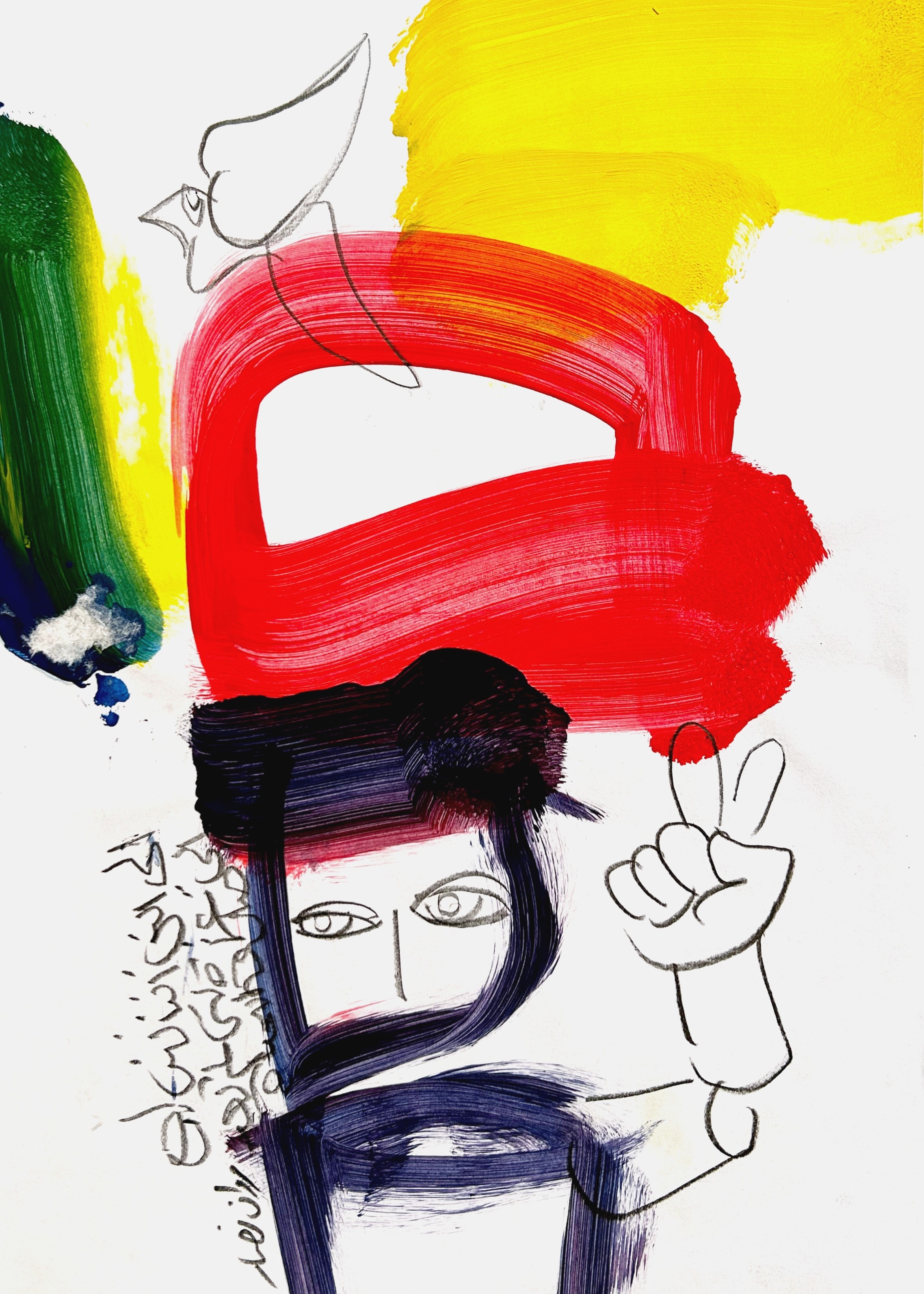 تتسم لوحات مروان نصّار Marwan Nassar بتداخل تجريدي تعبيري مع إشارات رمزية حادّة، تحمل في جوهرها طيفاً من الدلالات النفسية والسياسية والثقافية. فلوحاته تمزج بين خطوط يدوية سريعة تشبه رسوم الأطفال أو رسوم الكهف من جهة، وبين ضربات فرشاة لونية كثيفة وواعية من جهة أخرى، ما يخلق توتراً بصرياً جذاباً بين العفوية والانضباط. استخدام الألوان على شكل لطخات كثيفة (الأصفر، الأحمر، الأخضر، الأزرق، والأسود) يشير إلى حضور تعبيري قوي، حيث اللون ليس خلفية بل فاعل سردي. كما أن العينان الواسعتان في الوجه الأبيض ترسّخ نظرة ثاقبة وواعية، تُذكّر بجماليات «الوجوه المجهولة» في فنون الغرافيتي أو فن الشارع، وكأن الشخصية هنا تشهد شيئاً، أو تُحمّل رسالة. فهل من رمز مقاوم، يرتبط بثقافات التحرّر والتحدّي والاحتجاج السلمي؟ وهل اليد المرسومة بخط دقيق بسيط يتضاد مع الكثافة اللونية لباقي اللوحات؟ أم هي رموز تعبيرية مستبطنة بصريا؟