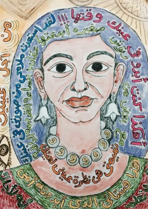 تكشف لوحة الفنانة التشكيلية المصرية «إيفلين عشم الله» عن تعقيد سردي وجمالي يختبئ خلف ملامحها الفطرية. هي ليست مجرد رسم لوجه نسائي تحيط به كلمات متداخلة؛ إنها بناء بصري يحمل شيئاً من التميمة وشيئاً من الأيقونة الشعبية وشيئاً من الفنّ الفطري الذي يقوم على الصدق الداخلي أكثر مما يقوم على قواعد الأكاديمية. هذا التوتر بين البراءة الظاهرية والشحنة الرمزية العميقة هو ما يجعل اللوحة قابلة لقراءة طويلة، ومتعددة الطبقات، ومرتبطة بذاكرة الجماعة أكثر مما ترتبط بحدود فردية. إذ يحتل الوجه النسائي مركز اللوحة، ليس فقط بموقعه، وإنما كذلك بطريقة تموضعه: عينان كبيرتان مفتوحتان على اتساعهما، حاجبان مقوّسان، شفاه رقيقة، ورقبة تحمل ثقل قلادة ضخمة. الخطوط التي ترسم ملامح الوجه ليست خطوطًا منظمة، بل مقصودة في خشونتها؛ إنها أقرب إلى خطّ أيقونة أو رسم طفولي متقن بمعنى الروح لا بمعنى التقنية. وهذا الخيار يمنح الوجه بعداً رمزياً .إنه ليس وجه امرأة بعينها، بل وجه «المرأة–الحكاية»، أو «المرأة–الذاكرة»، أو «المرأة–الأم الكبرى» التي تلتقي فيها ملامح الأسطورة والبيئة الشعبية.