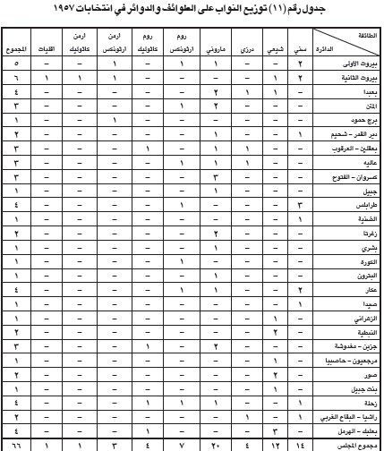 وبموجب قانون 24 شباط 1957 وزّعت المقاعد الـ66 على النحو التالي: