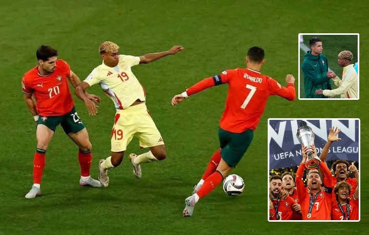 فخلال الايام الماضية، قام الاعلام الاسباني وتحديدا التابع لبرشلونة، بشحن الجمهور والشارع الرياضي تجاه بطولة دوري الامم الاوروبية، لدرجة ان لامين استساغ "اللعبة" بعد تصريحه الشهير قبل لقاء فرنسا بنصف النهائي، حين قال "اذا رغبتم ان تحسموا البالون دور يوم الخميس في مباراة فرنسا واسبانيا فأنا قبلت التحدي"، وما زاد الطين بلة، ان منتخب اسبانيا فاز بمجهود مميز من لامين بنتيجة 5-4، وهكذا وجد اعلام برشلونة ان الفرصة سانحة لاذلال اسطورة ريال مدريد الدون رونالدو، وكان لافتاً تعمد الفتى الاسمر الاحتفال على طريقة رونالدو عقب احد هدفيه بمرمى الديوك، لكن الرياح جرت بما لا يشتهون، فغاب وهج لامين في حضرة الهداف التاريخي للمنتخبات، واحد افضل اللاعبين في التاريخ، فحول تأخر منتخبه الى تعادل بهدف شخصي 2-2، قبل الحسم بركلات الترجيح على حساب إسبانيا بنتيجة 3-5، ليحمل رونالدو ورفاقه الكأس القاري الثالث بتاريخه بعد يورو 2016 ودوري الأمم 2019.