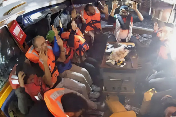 وأظهرت صورة أفراد الطاقم وهم يجلسون على السفينة وقد ارتدى الجميع سترات نجاة وأياديهم مرفوعة.