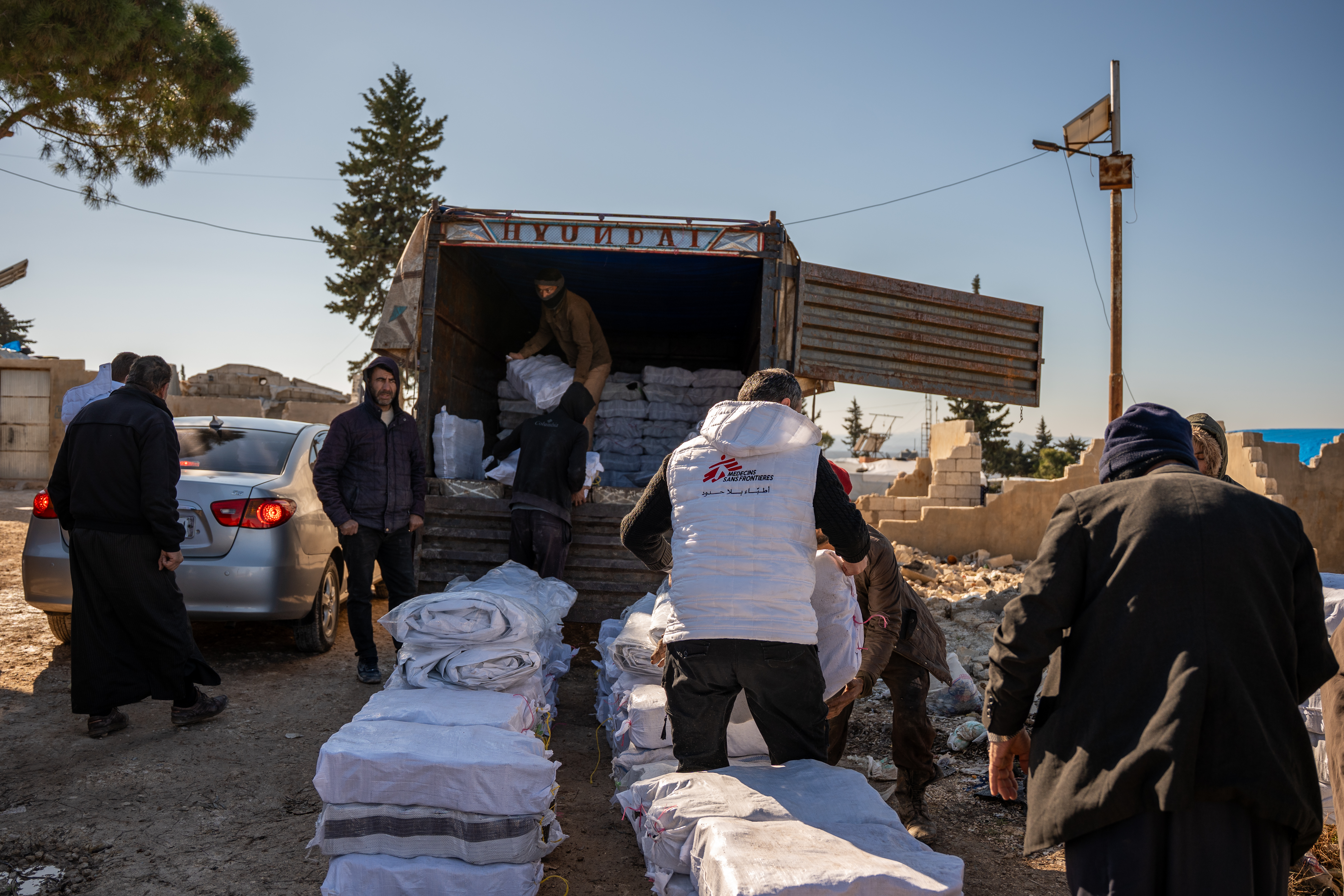 في محافظة إدلب، تقدم أطباء بلا حدود الدعم للعائلات النازحة. فبين ديسمبر/كانون الأول وفبراير/شباط، وزعت فرق أطباء بلا حدود مواد التدفئة (نحو 600 طن منها) وأغطية بلاستيكية على 2,000 عائلة في 21 مخيمًا. كما وُزّعت 1,400 فرشة و4,200 بطانية ومستلزمات نظافة وأدوات طهي إضافية على 700 عائلة في مخيمات قرب سلقين وفي جبال حارم، وحصلت 150 عائلة على خيام في أرمناز في ريف إدلب. تهدف هذه التوزيعات إلى مساعدة العائلات على تحمّل أشهر الشتاء القاسية وتقليل المخاطر الفورية المرتبطة بالتعرض للبرد. ومع ذلك، لا تزال الفجوة بين الاحتياجات والمساعدات هائلة.