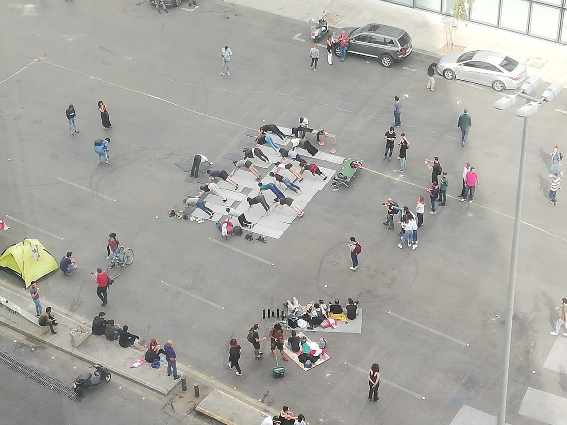 قامت مجموعة من الشبان والشابات بممارسة الرياضة الصباحية في وسط الطريق عند جسر الرينغ، كما قاموا بوضع سجادات التمارين والمعدات الرياضية اللازمة كأي حصة رياضية.