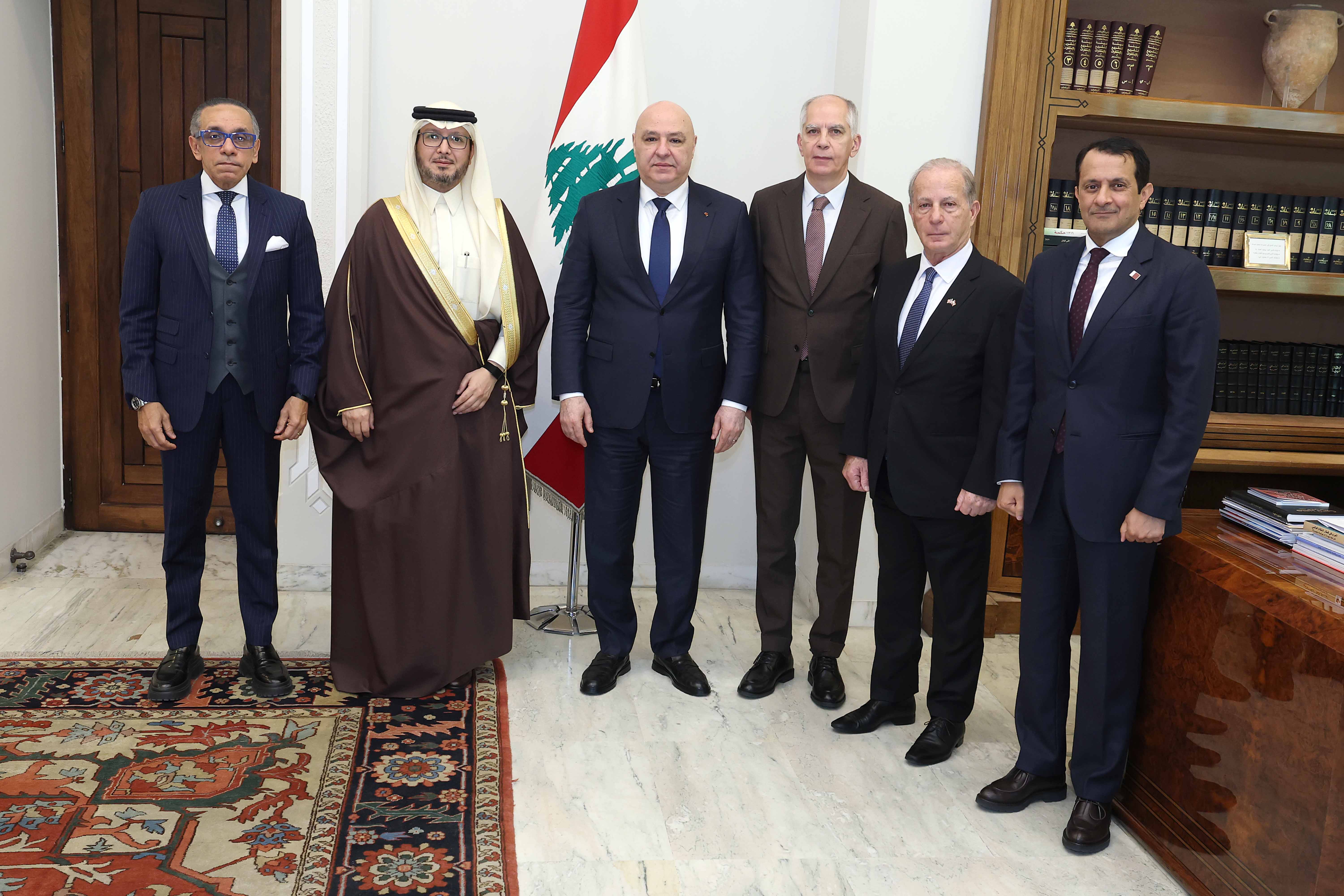 وضم وفد اللجنة الخماسية: سفراء المملكة العربية السعودية وليد البخاري، وفرنسا هيرفيه ماغرو، وقطر الشيخ سعود عبد الرحمن آل ثاني، ومصر علاء موسى، والولايات المتحدة الأميركية ميشال عيسى، الذين استوضحوا الرئيس عون عن الأوضاع الراهنة والمعطيات المتعلقة بالقرارات التي اتخذها مجلس الوزراء امس.