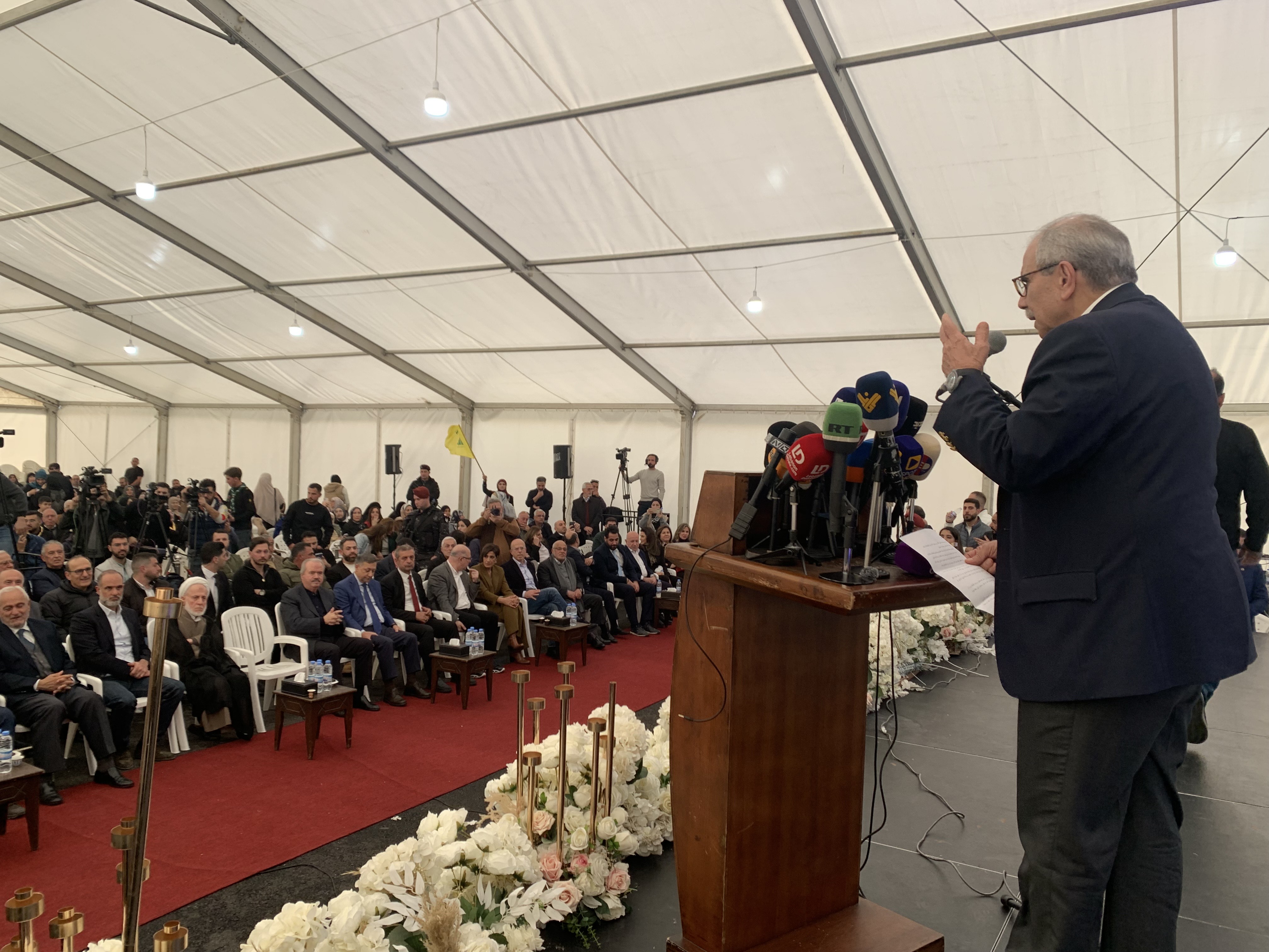 أضاف: إن وجود الدولة اليوم هنا هو رسالة في مواجهة هذا الدمار الهائل الذي لن نستسلم له أبدا. فبسط سلطة الدولة لا يكتمل إلّا للمدرسة، والمركز الصحي، والمياه والكهرباء والاتصالات، والطرق سالكة.