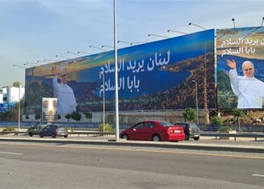 رفعت لافتة ضخمة عند طريق المطار ترحيباً بزيارة البابا لاوون الرابع عشر، كُتب عليها "لبنان يريد السلام، بابا السلام".