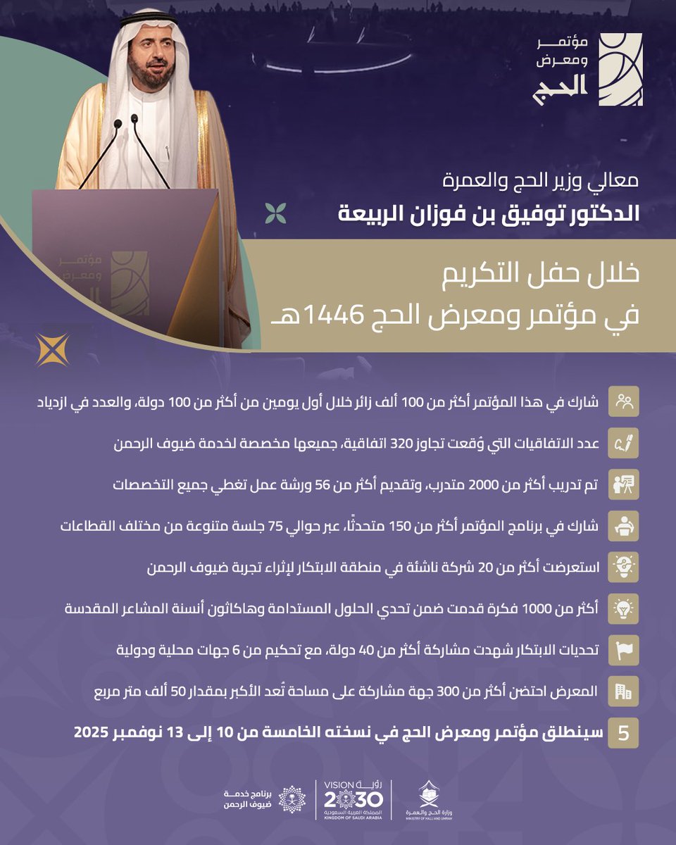 وأعلن وزير الحج الدكتور توفيق الربيعة عن إقامة النسخة الخامسة من مؤتمر ومعرض الحج في الفترة من 10 إلى 13 تشرين الثاني 2025، في إطار استمرار الجهود الحثيثة لتحسين وتطوير كافة جوانب تجربة الحج بما يتماشى مع رؤية المملكة 2030.