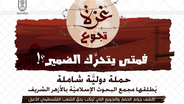 كذلك أطلِق مجمع البحوث الإسلاميَّة بالأزهر الشريف، أمس الأربعاء حملةً دوليَّة شاملةً لدعوة دعاة العالم للمشاركة الفاعلة في مواجهة سياسة الكيان الصهيوني لتجويع أهل غزة وإجبارهم على النزوح، وذلك بعنوان: (غزَّة تجوع.. متى يتحرَّك الضمير العالمي؟!)، في إطار مسؤوليَّته الدِّينيَّة والإنسانيَّة والأخلاقيَّة لكشف جرائم الحصار والتجويع التي تُرتكَب بحقِّ الشعب الفِلَسطيني الأعزل، وتأكيداً لدَور الأزهر التَّاريخي كصوتٍ للحقِّ، وضميرٍ حيٍّ للأمَّة والإنسانيَّة.