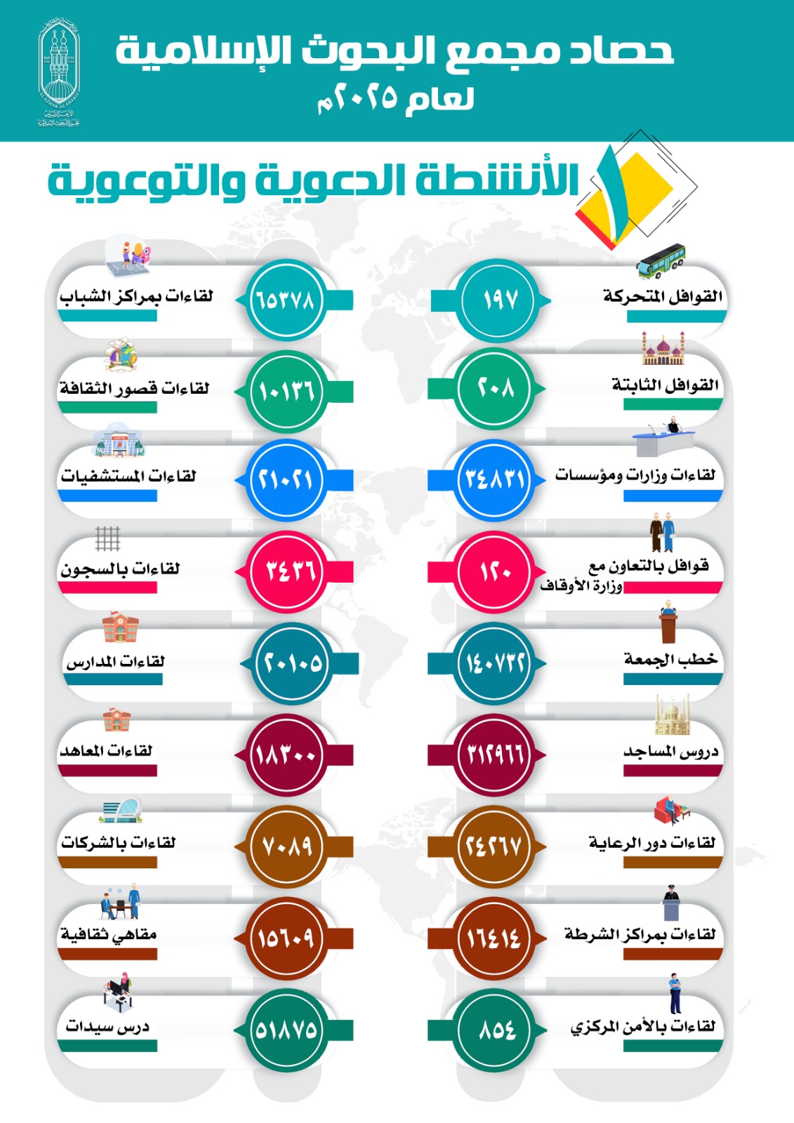 ولم يقتصر الأمر على ذلك؛ بل تناولت الأنشطة الدعويَّة مخاطر الشائعات وأثرها السلبي على الأفراد والمجتمع، وأهميَّة إتقان العمل بوصفه منهجاً إسلاميًّا، إلى جانب مواجهة الإدمان والمخدرات، والحفاظ على البيئة واحترام النظام العام، كما ركَّزت البرامج على قيمة طلب العلم وأثره في نهضة المجتمع، إلى جانب موضوعات أخرى متنوعة تعكس التحديات اليوميَّة التي يواجهها المواطنون؛ بهدف تمكينهم من التعامل مع الحياة بمسؤوليَّة ووعي، وتعزيز ثقافة الوسطيَّة والالتزام بالقيم الأخلاقيَّة والدِّينيَّة.