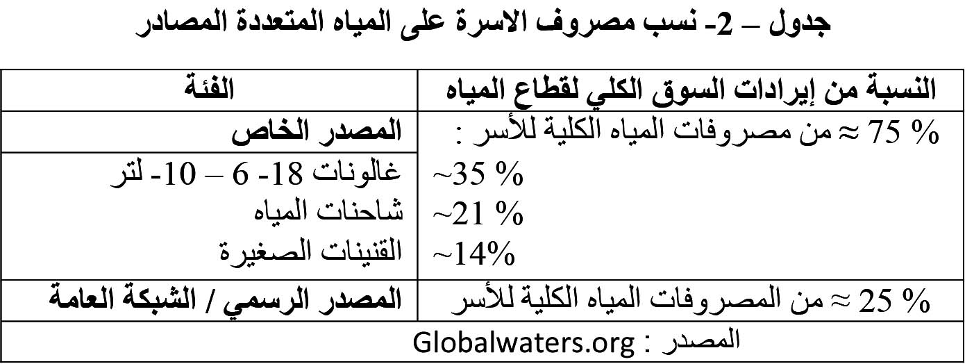 خلاصة القول انه على المدى القصير فان الصهاريج تخفّف معاناة المواطنين وتمنع العطش الفوري، أما على المدى الطويل فترفع الكلفة المعيشية (جدول -2-) وتزيد الفجوة بين الطبقات، وقد تهدّد الصحة العامة إذا لم يكن هناك تنظيم ورقابة.
