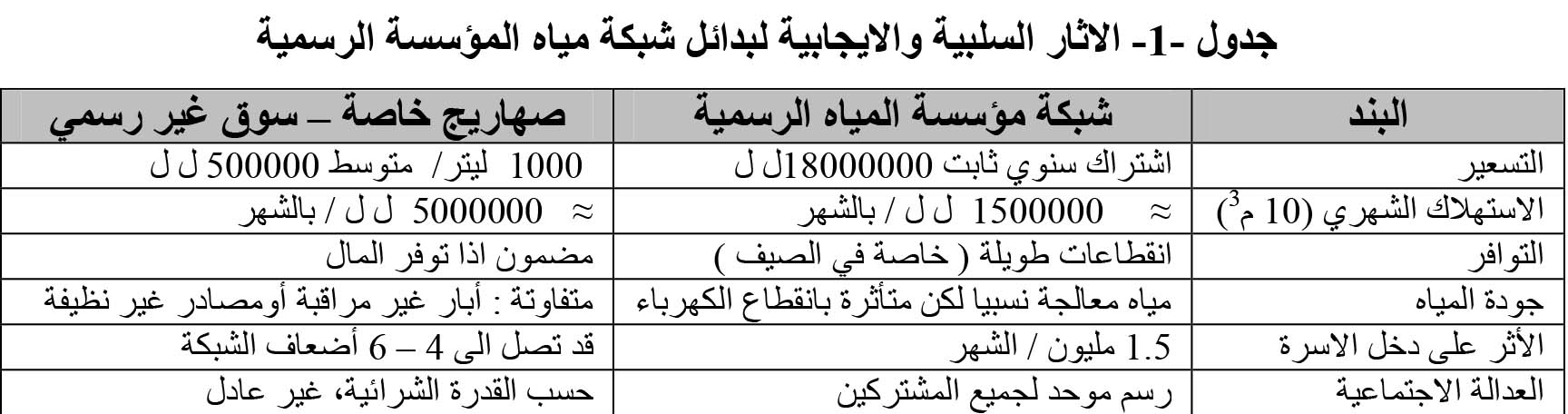 من الحريّ القول أن بديل مياه المؤسسة الرسمية كمياه الصهاريج والمياه المعبأة له آثاره الإيجابية كما السلبية (الجدول -1-)، فمن إيجابياته مثلا تأمين مصدر مياه بديل وسريع، فالمواطن يحصل على الماء عند انقطاع الشبكة الرسمية، وهذا يعني استمرار الحياة اليومية (شرب، طبخ، نظافة)، كما يقلّل من الاضطرار إلى تخزين المياه لفترات طويلة أو التنقل لمسافات لملئها. ومن إيجابياته أيضا مرونة في التوزيع، الصهاريج تستطيع الوصول إلى الأحياء بسرعة، حتى عند توقف الضخ المركزي. كما أن بعض الشركات تتيح خدمة طوارئ أو حجز عبر الهاتف/واتساب مما يُخفّف الضغط النفسي على العائلات. والإيجابية الأخيرة توفير فرص عمل غير مباشرة، فتشغيل الصهاريج يعني وظائف للسائقين، العمّال، وحتى خدمات مساندة (صيانة، بيع قطع غيار، فحوص جودة)... الخ..