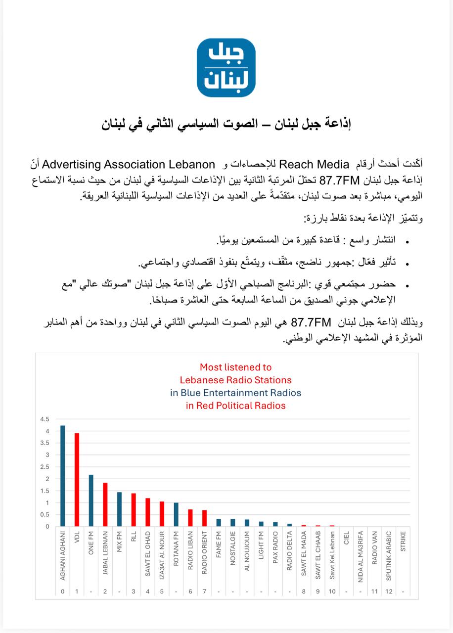 أظهرت أحدث إحصاءات Reach Media بالتعاون مع Advertising Association Lebanon أن إذاعة جبل لبنان 87.7FM تحتل المرتبة الثانية بين الإذاعات السياسية في لبنان من حيث نسبة الاستماع اليومي المباشر، متقدمة على العديد من الإذاعات اللبنانية العريقة، وتأتي مباشرة بعد «صوت لبنان».