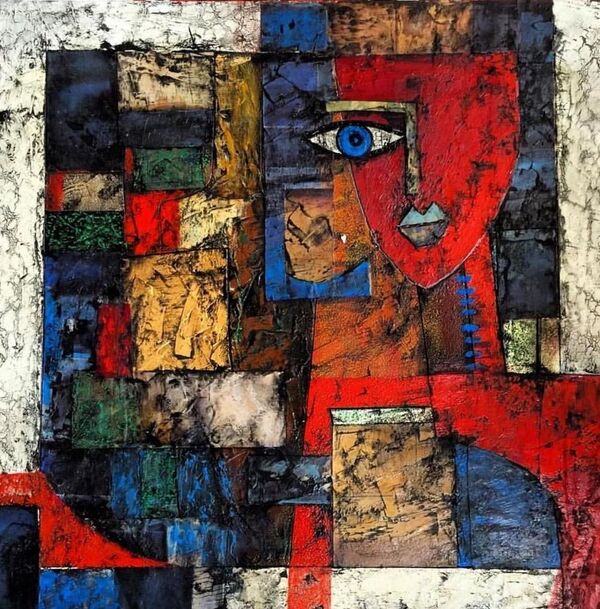 في زمنٍ باتت فيه الوجوه متكررة والهوية محاصرة، تنهض هذه اللوحة كصرخة بصرية تخرق الصمت، وتُقدّم وجهاً إنسانياً لا بوصفه ملامحاً مألوفة، بل كخريطة شعورية مشحونة بالألوان والانفعالات. بجرأة الأحمر، وهدوء الأزرق، وانفجار الأصفر، يندفع الوجه من قلب القماشة ليعلن حضوره غير القابل للتجاهل. إنها ليست مجرد لوحة تجريدية، بل تجربة حسّية تتحدّى المتلقّي وتدفعه للتأمّل فيما وراء المظهر. العين الزرقاء البارزة، المتوسّطة تقريباً للّوحة، ليست هندسة بصرية أو لغة تشكيلية تجريدية فحسب، بل بؤرة وجود جمالية وعدسة وعي، وربما مرآة داخلية. إنها نظرة لا تُراقب العالم بل تكشفه، وكأنها عين الرسّام نفسه، المعلّقة بين الداخل والخارج، بين الانفعال والتجريد.
