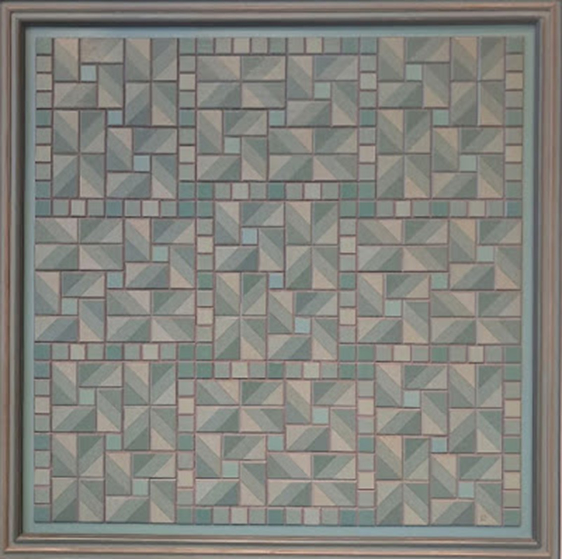 لكن هذا البحث عن الهوية عبر الأشكال الهندسية لا ينفصل عن الذاكرة الثقافية الشعبية في المنطقة، والتي كانت، ولا تزال، جزءاً من الحياة اليومية. إذ يربط طرزي بين اللوحة الحديثة وتاريخ طويل من الزخارف والنقوش التي كانت تزين النسيج العربي، من التطريز التقليدي إلى زخارف الموزاييك. ففي لوحته، يواصل جبران طرزي هذا التسلسل الزمني ويُعيد تفسير الرموز القديمة بلغة حديثة، من خلال التكرار المنتظم للأشكال الهندسية. المربعات تشبه النسيج نفسه؛ الفراغات بين الخطوط، والحواف الدقيقة، تُحاكي خيوط التطريز التي تُمثل الذاكرة الجماعية. وعندما نركز على اللون الأخضر المائي الذي يميز اللوحة، نكتشف أنه ليس مجرد اختيار جمالي، بل هو لون الفيروز الذي كان يُستخدم في الطقوس القديمة كرمز للحياة والنمو. هذا اللون يرتبط ارتباطاً وثيقاً بأسطورة أدونيس وبعل، حيث يشير إلى دورة الحياة المتجددة في الربيع.