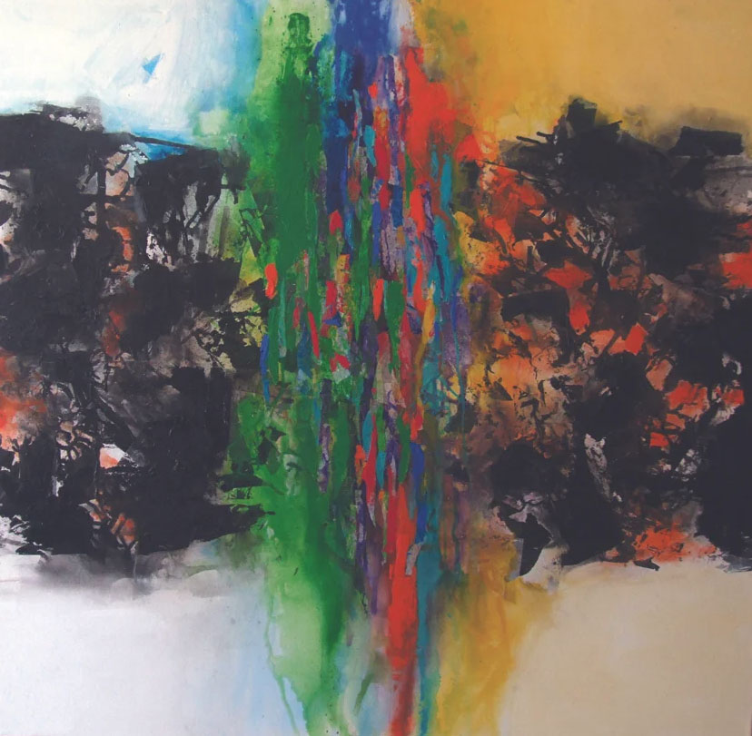 أنّ العين لا تتلقّى سطحاً صامتاً بل تدخل في تجربة متوترة، كأنها تعبر حدوداً بين قوتين متعارضتين، بين خط يمتد أفقاً بجموده وثقله، وبين خط يندفع عمودياً بجرأته وطاقته، بين ما يسحبنا إلى سكون الأرض وما ينهض بنا إلى احتمالات العلو. الأفق مشوّش جداً بعيداً عن الفطرة أو البراءة الكونية إن صح اقول، يمكن اعتباره كتلة كثيفة، شريط داكن يفرض على المشهد وزنه الثقيل، كأنه يقيم جداراً يحجب الأفق نفسه، يحيل الامتداد إلى انسداد، ويحوّل الخط الذي عادة ما يوحي بالانفتاح إلى أفق مغلق، غارق في سواده، كأنه أثر زمني لا ينتهي من التراكم والبلادة. هذا الأفق يشبه مسرحاً للحياة اليومية، ثقل العادة، عتمة التكرار التي تسجن العين في أفق لا يَعِد بغير التكرار. فهل وسط هذه العتمة يندفع العمودي، شريط من الألوان المتفجرة، باخضراره يرمز إلى خصوبة الحياة؟ وهل الأحمر يوحي بنبض الدم والحرارة؟ أم أن الأزرق يستدعي صفاء الماء أو عمق الروح؟
