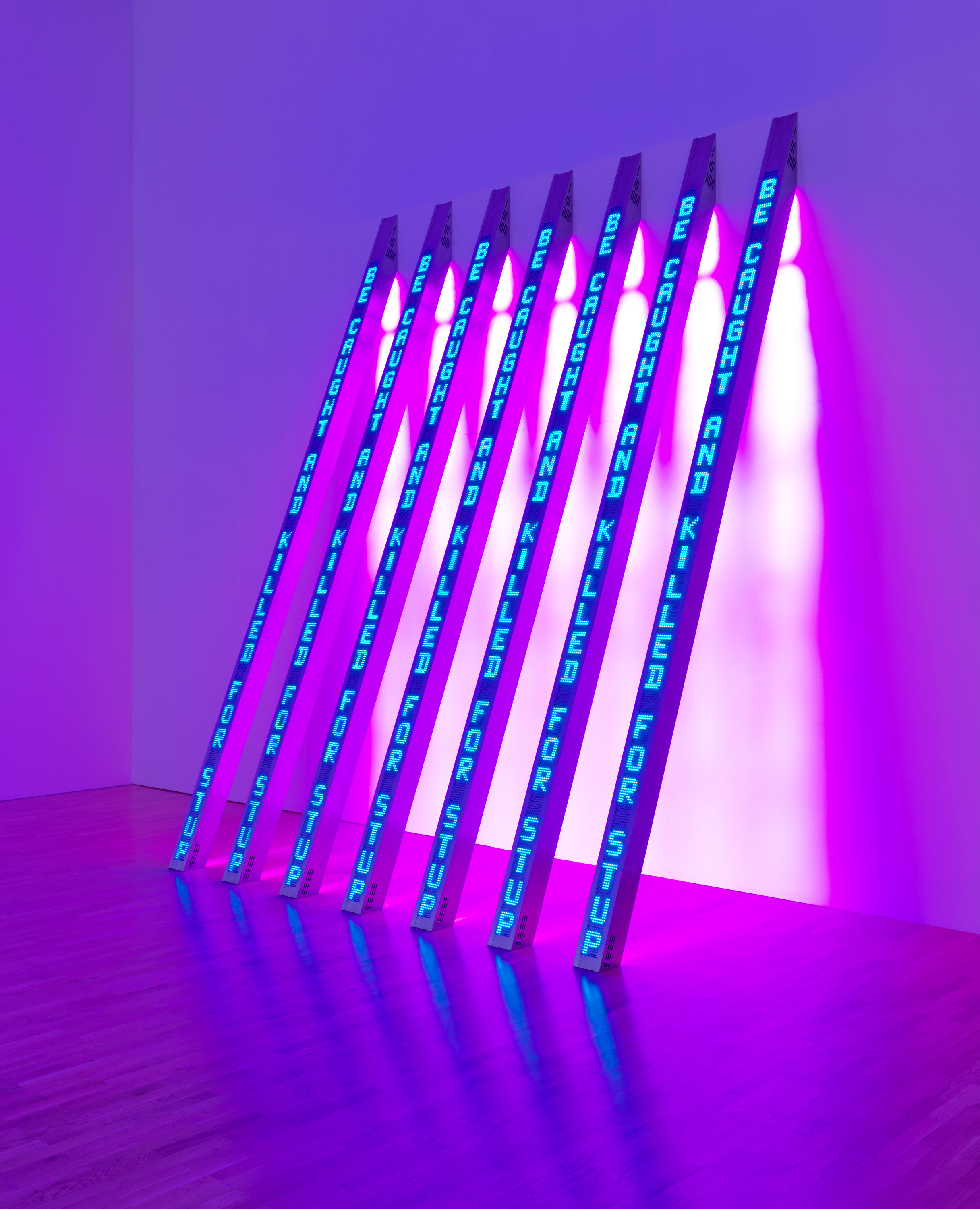 بعيداً عن الجماليات التقليدية، فإن أعمال جيني هولزر تطرح فكرة الجمال بوصفه وعياً، لا زخرفة. فهي تُزيح الفن من موقع التأمّل السلبي إلى مساحة التفاعل الحاد، حيث تصبح الكلمة بحد ذاتها حدثاً بصرياً يُحرّك الإدراك، ويُعيد تموضع الإنسان في وجه الحقيقة. هذا العمل الضوئي، لا يقف المشاهد أمام قطعة جمالية فحسب، بل أمام احتجاج صامت ينبض بالضوء. قضبان النيون، المائلة كما لو أنها تستند على آخر رمق من توازن هش، تبدو كأنها مقابر مستقبلية أو شواهد قبور معلّقة في الفراغ.الجملة التي تتكرر على كل عمود: