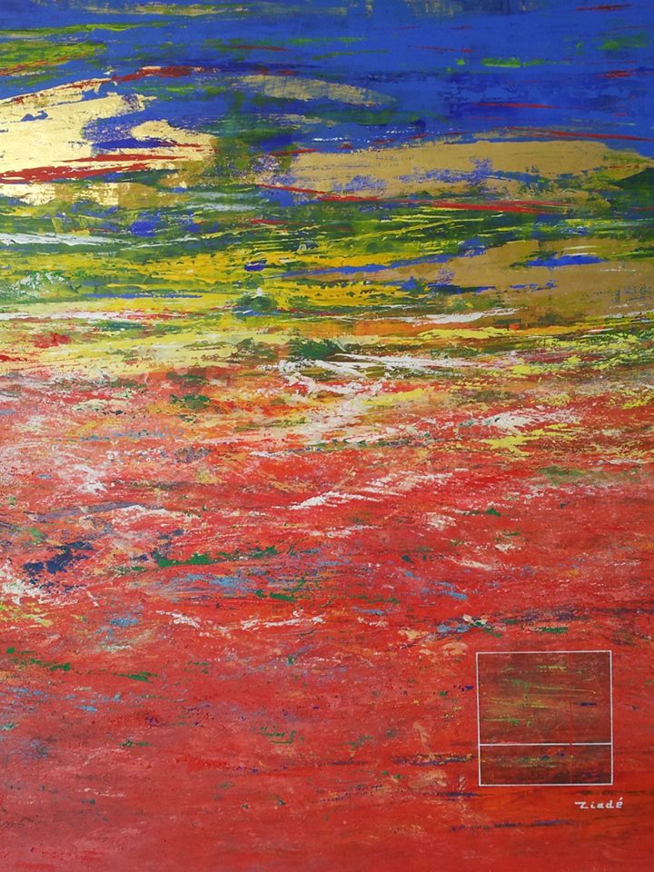 فاللوحة تنقسم بصرياً إلى ثلاث طبقات لونية أفقية: العلوية (زرقاء وذهبية): توحي بالسماء أو الأفق العالي، فيها عمق واتساع، وتُذكّر بالكون أو اللاوعي. الوسطى (أصفر وأخضر): توحي بالحياة، الحركة، الغنى، ربما النباتات أو الحقول. السفلى (أحمر مشتعل): تُعبّر عن الأرض، الجذور، الانفعالات القوية أو حتى الألم الداخلي. كما أن استخدام الألوان ليس اعتباطياً، بل ينسج طبقات نفسية وعاطفية: الأحمر يوحي بالجسد/ الأرض/ الدم، الأصفر يوحي بالفكر/ الحركة/ الطاقة، الأزرق يوحي بالروح/ السماء/ التأمّل. فماذا عن جيومترية اللوحة وهندسيتها؟