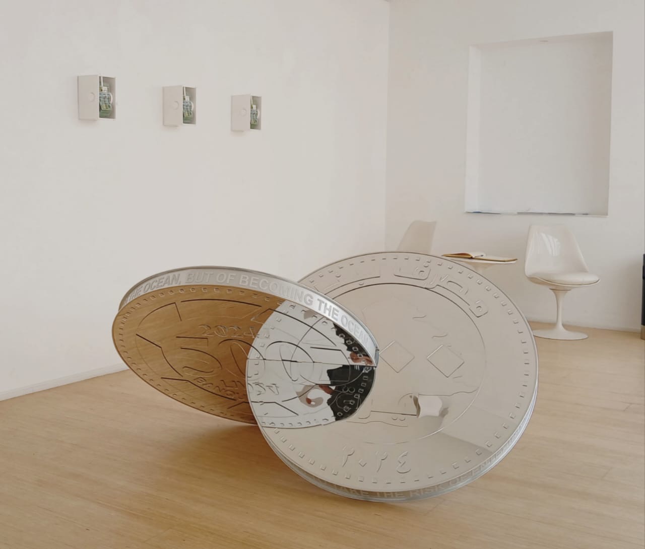 بعيداً عن الفيديو، يتجلّى التناقض بين الصوت والصمت في أحد الأعمال التركيبية في المعرض. كتلة من العملات المعدنية، متشابكة ببعضها البعض، تدور بفعل دفع الجمهور لها، لكنها رغم احتكاكها بالأرض لا تصدر أي صوت. قد يكون ذلك بسبب خفّة وزنها وفراغها، في دلالة رمزية على أن هذه النقود أصبحت اللاشيء. فالعملات المعدنية عادةً ما تصدر ضجيجاً لتعلن عن وجودها، لكنها هنا تبدو وكأنها فقدت قيمتها الفعلية، لتُظهر لنا وهم الحركة الاقتصادية المنفصلة عن الواقع.