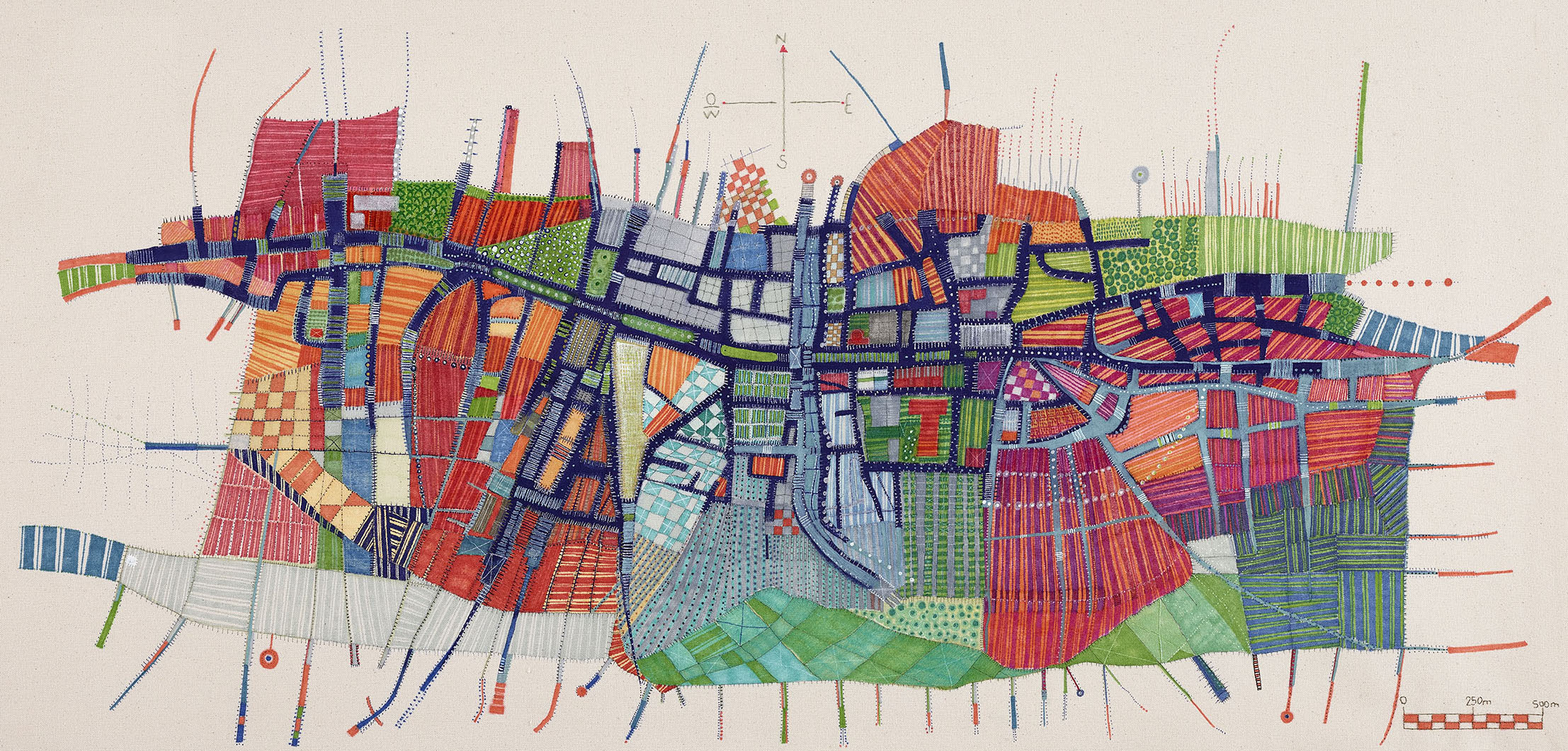 ولدت دينا ديوان في بيروت، وهاجرت خلال الحرب الأهلية اللبنانية، لكنها ظلت تحمل المدينة كجرحٍ وكحكاية داخل أعمالها. ما يميزها هو أنها لا ترسم المدينة، بل تُطرّزها، كأنها تعيد خياطتها لتمنحها تماسكاً بعد التمزّق. في مشروعها الأشهر «Wandering City» (المدينة التائهة)، استخدمت القماش والخيط والخريطة كمكوناتٍ رمزية لبحثٍ في معنى الانتماء، الفقد، والذاكرة الجمعية. في «Wandering City»، لا تظهر بيروت بوصفها مشهداً بانورامياً أو صورة فوتوغرافية، بل كبنيةٍ ماديةٍ تُحاك على القماش. الشوارع تُطرّز بخيوط دقيقة، الأحياء تُحدد بالألوان، والتواريخ تُخاط أحياناً إلى جانبها، في تزاوج بين الخرائطية والهشاشة الإنسانية.