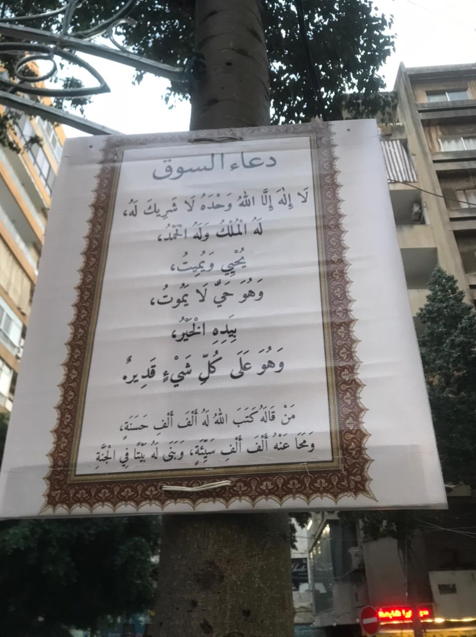 لفتني مؤخّراً لافتات معلّقة على شجر الأرصفة في شارع تجاريّ في بيروت ، ذكر فيها «دعاء السوق».