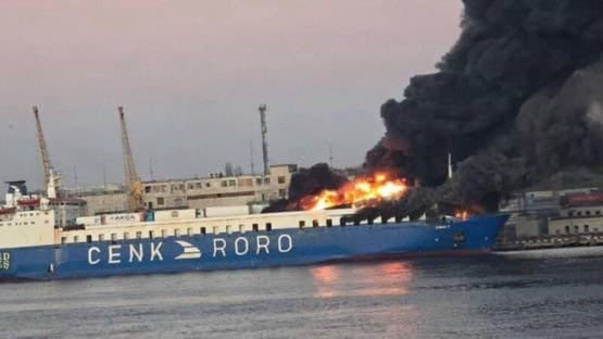 اشتعلت النيران في سفينة مدنية بعد هجوم روسي على أوديسا، جنوب أوكرانيا، الجمعة. ورصدت صور حريق السفينة المملوكة لشركة تركية.