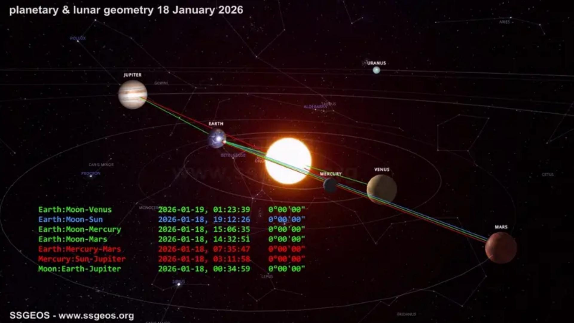 نشر راصد الزلازل الهولندي فرانك هوغربيتس، صورة تُظهر اصطفاف عدد من الكواكب بينها الزهرة وعطارد والمريخ والمشتري، واقترانها مع الأرض والشمس والقمر، مشيراً إلى أن تلك هي هندسة الكواكب التي يشهدها الفضاء اليوم الأحد 18 كانون الثاني. كما توقّع في تدوينة أخرى على مواقع التواصل الاجتماعي بحدوث زلزال بقوة 8 درجات على مقياس ريختر، محدداً بلداً بعينه.