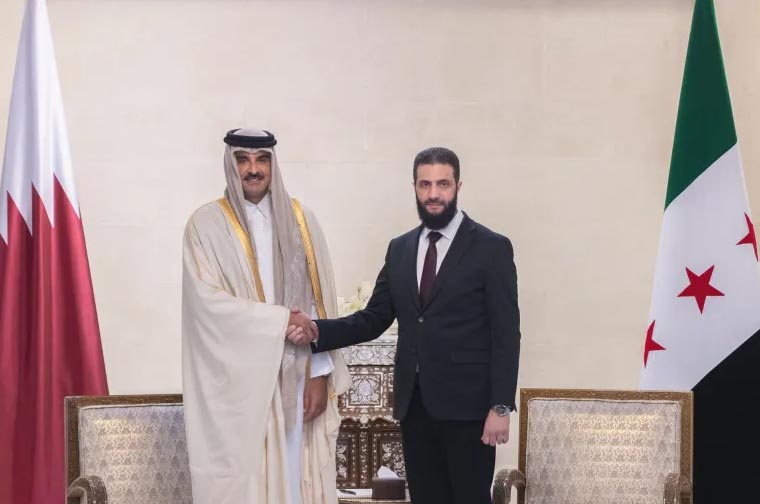 من جهة أخرى استقبل الرئيس السوري في المرحلة الانتقالية أمس أمير قطر الشيخ تميم بن حمد آل ثاني في مطار دمشق الدولي في أول زيارة لرئيس دولة في سوريا منذ الإطاحة بنظام بشار الأسد حيث ناقش الطرفان مسألة إعادة الإعمار.