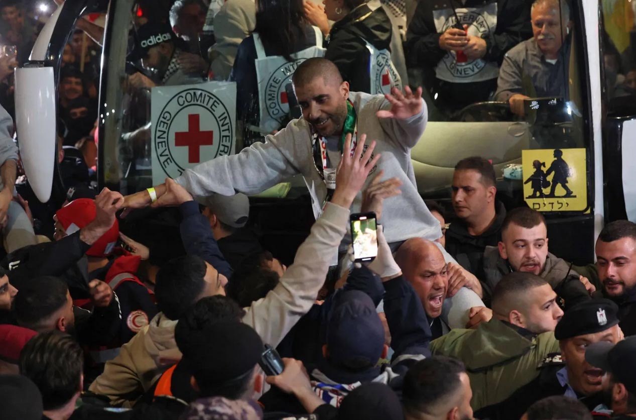 وظهر المعتقل زكريا الزبيدي (49 عاماً) وهو يُلوح بإشارات النصر من داخل الحافلة التي أقلّته من السجن.