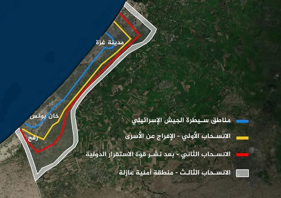 وبعد هذا الانسحاب الأولي لإتاحة إطلاق سراح الأسرى، ستنقل إسرائيل تدريجيا السيطرة على أراضٍ إضافية إلى قوة دولية عربية-إسلامية سيتم إنشاؤها، وتضمن نزع السلاح من القطاع.
